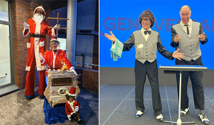 Mit dem großen Weihnachtsmann auf Stelzen und seinen Marionetten zum Empfang sowie den „Komischen Kellnern“ im weiteren Verlauf des Abends waren die Pico Bellos in mehreren Städten als Programm zur Weihnachtsfeier für die Mitarbeiter des Genoverbands e.V. gebucht und sorgten für beste Stimmung mit einem gekonnten Mix aus Animation, Magie und Improvisation.